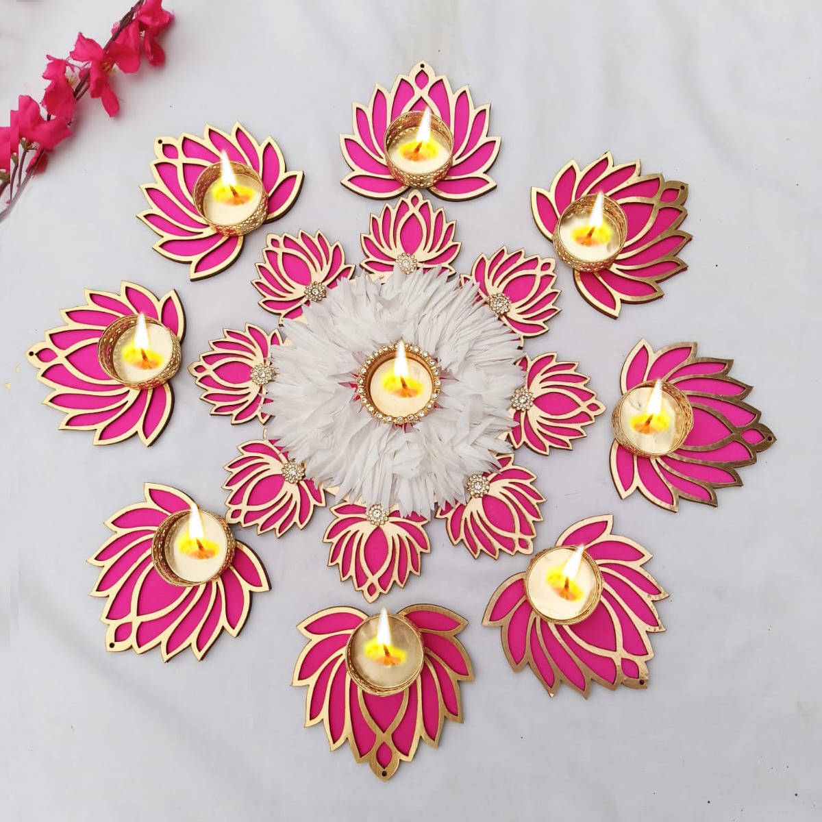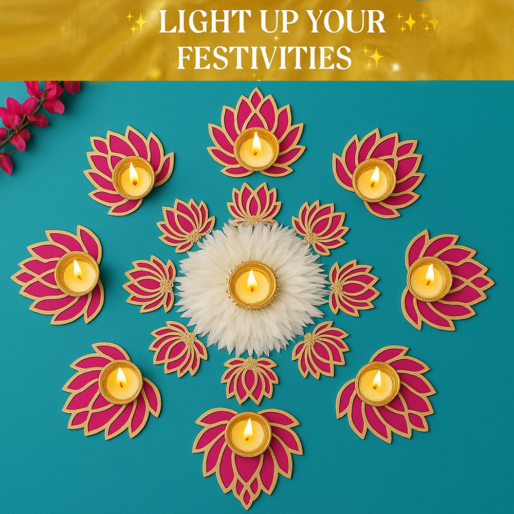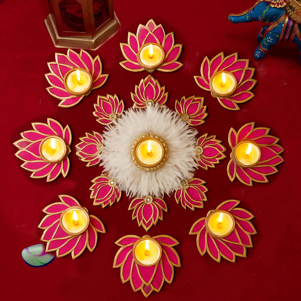 Be the first to review “Handmade 17 Pc Pink Lotus Rangoli Set | Decorative Tealight Diya & Candle Holder for Home, Navratri, Diwali, Laxmi Pooja & Temple Decoration”