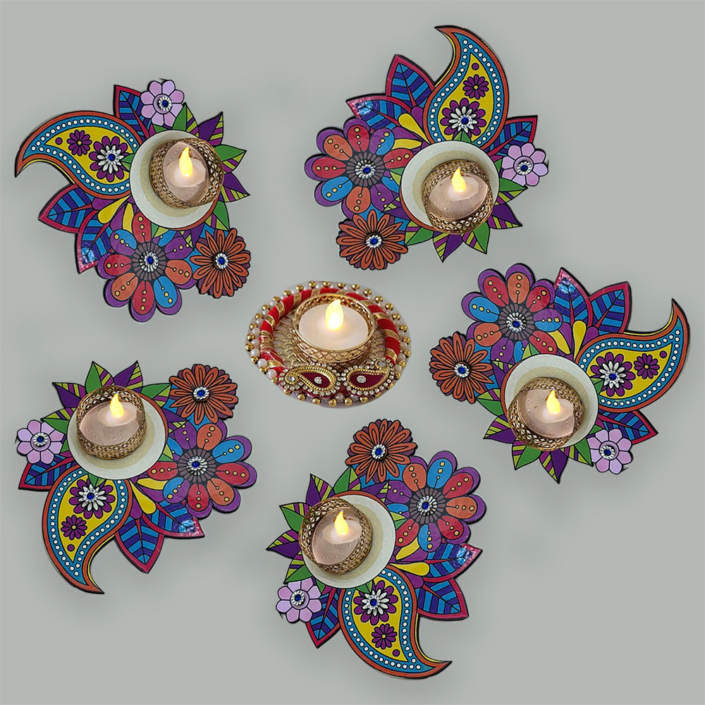 Handcrafted Rangoli Set with Diya Holders & with Wax Candle, Traditional Velvet Base Floor Decoration for Diwali, Wedding, Navratri, Pooja Room, Housewarming & Festival Décor